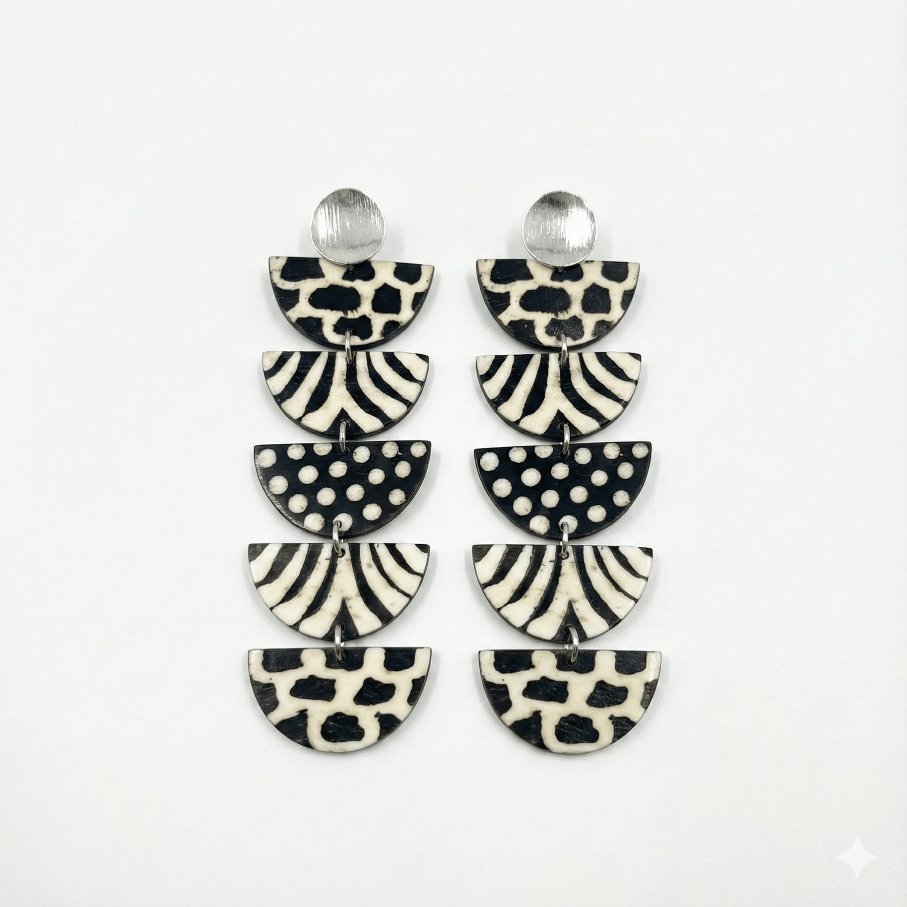 Our Kwayemu Monochrome Tiered Earrings feature hand-cut, lightweight bone pieces stacked into a cascading statement silhouette. Each tier is individually hand-painted in striking black-and-white patterns—polka dots, tribal curves, and abstract motifs—making every pair one-of-a-kind.