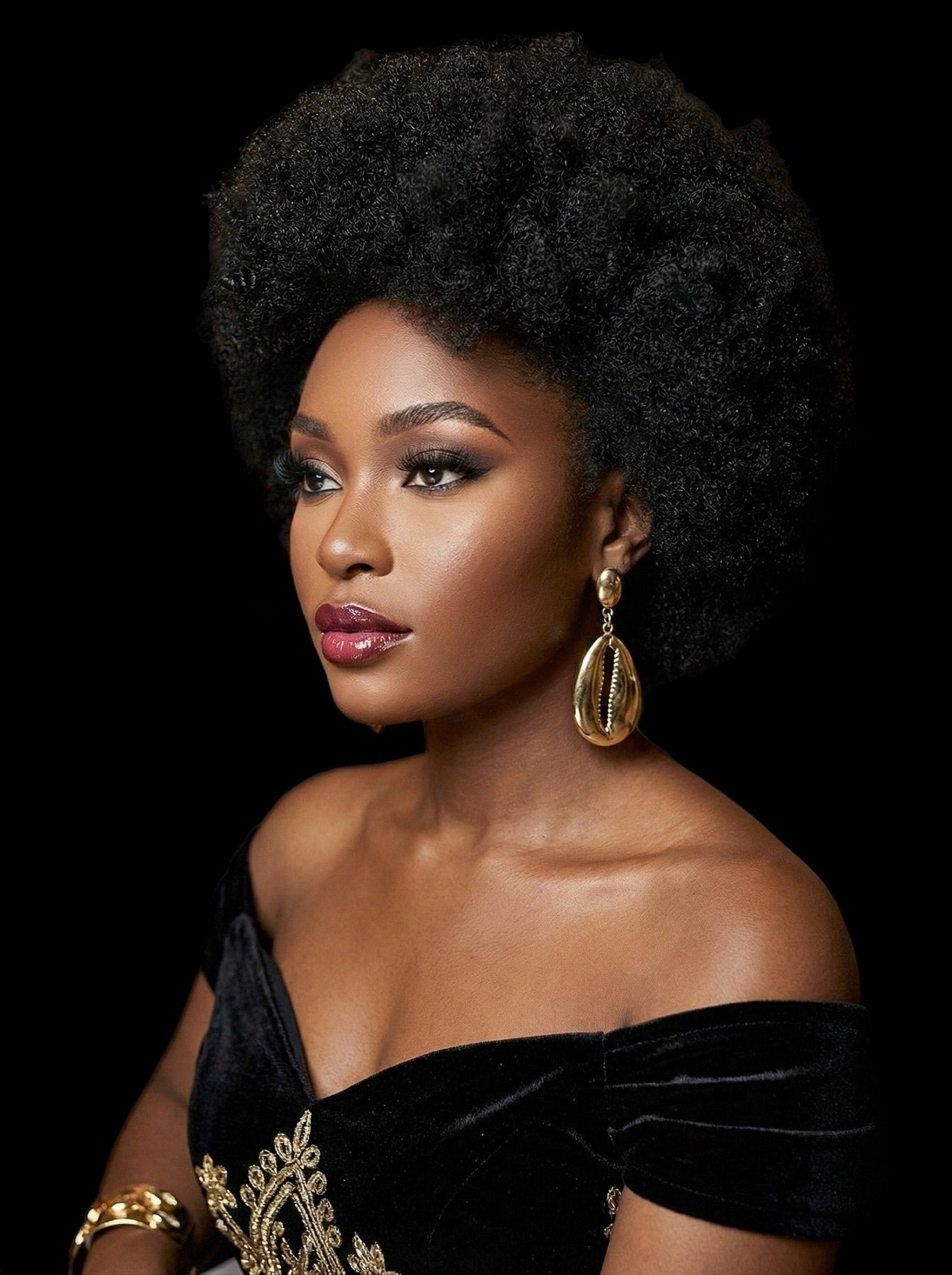 Oversized gold-tone cowrie shell earrings with a bold, sculpted finish—made to turn heads and honor heritage.