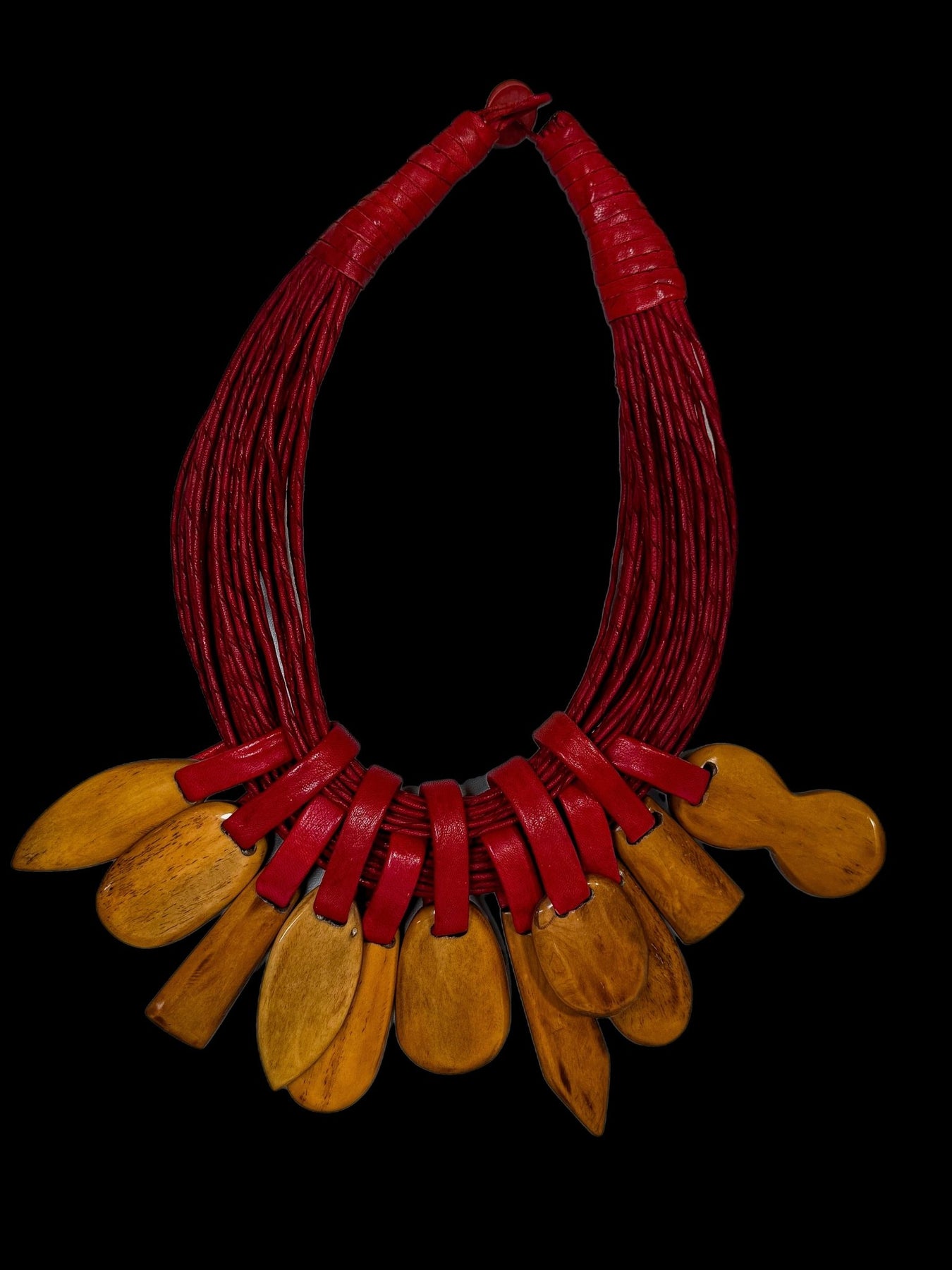 Handmade with authenticity and artistry, this bold statement necklace features a striking blend of genuine leather and polished ebony wood